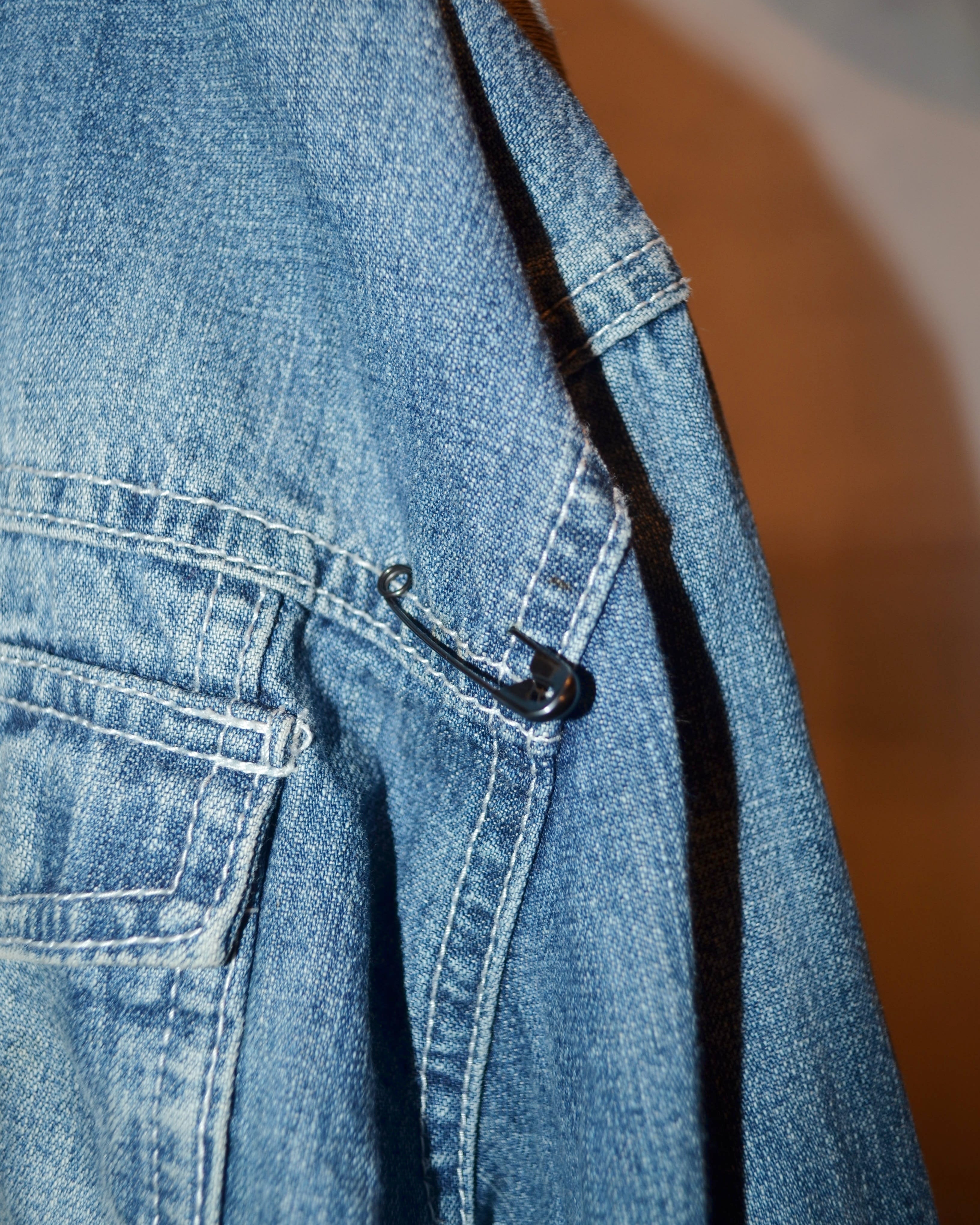 ヘタウマなハンドペイント、外れないようにがっちり取り付けられた安全ピン(写真9-10枚目)に曇った空みたいな物憂げの衝動**